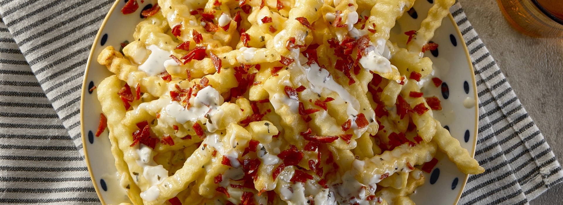 •누구나 좋아하는 치즈와 베이컨을 곁들여 크링클컷 프라이를 먹는 즐거운 방법